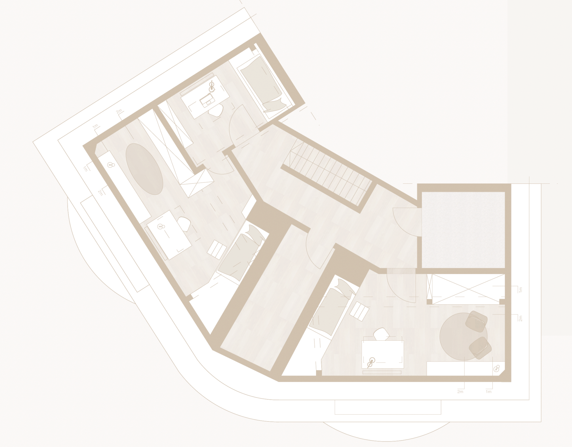 Im Dachgeschoss sind zwei gleichwertige Kinderzimmer für Zwillinge sowie ein zusätzlicher Raum entstanden, der Büro und Gästezimmer vereint. Die Planung reagiert mit individuell gefertigten Lösungen gezielt auf die Dachschrägen.