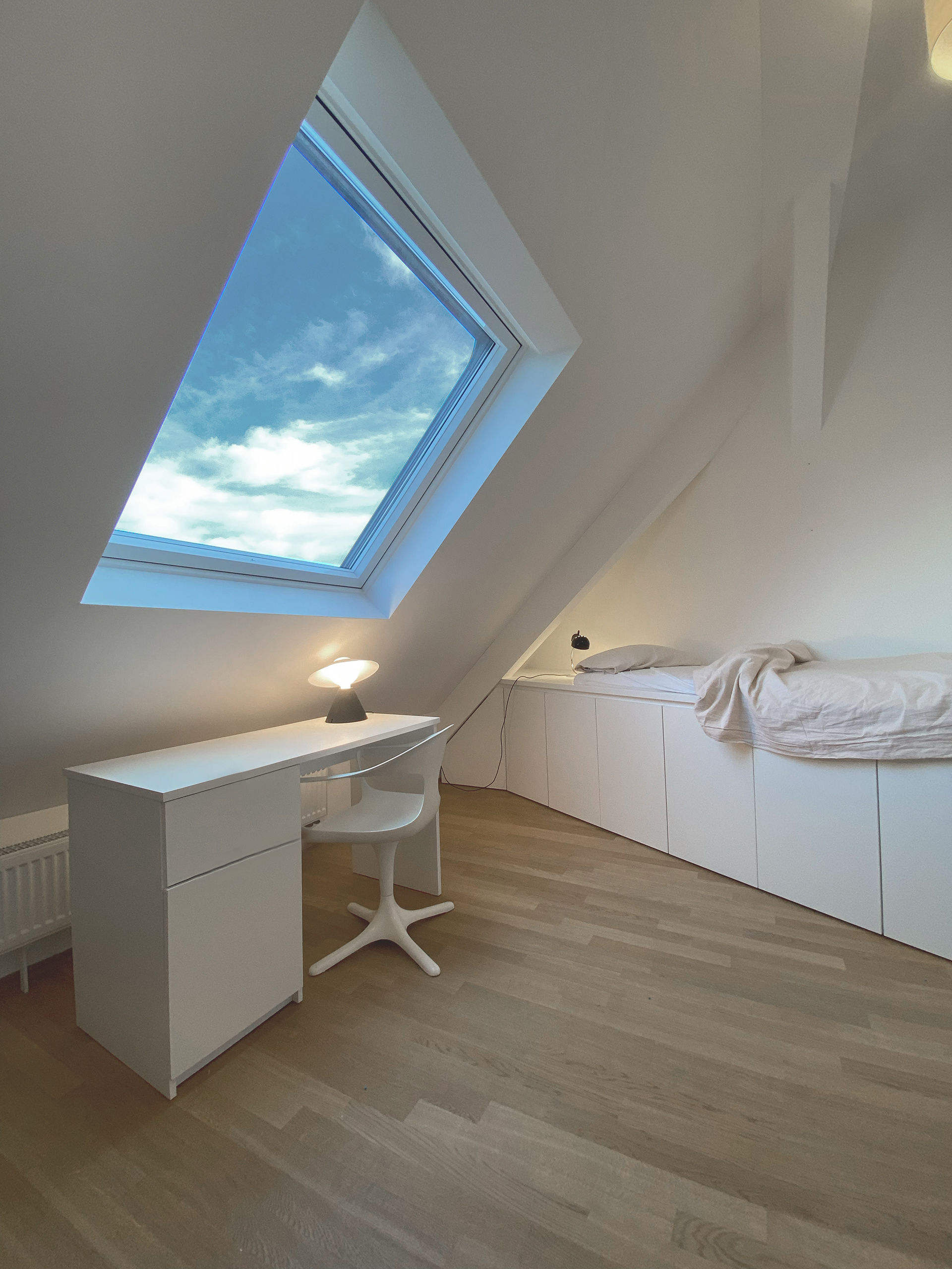 Beide Kinderzimmer folgen demselben Raumkonzept mit erhöhten Betten und Stauraum darunter sowie einem Blick durch das Dachfenster direkt in den Sternenhimmel. Weiße Wände bilden die ruhige Basis und wurden anschließend von den Kindern selbst gestaltet – bunt, individuell und genau so, wie sie es möchten.